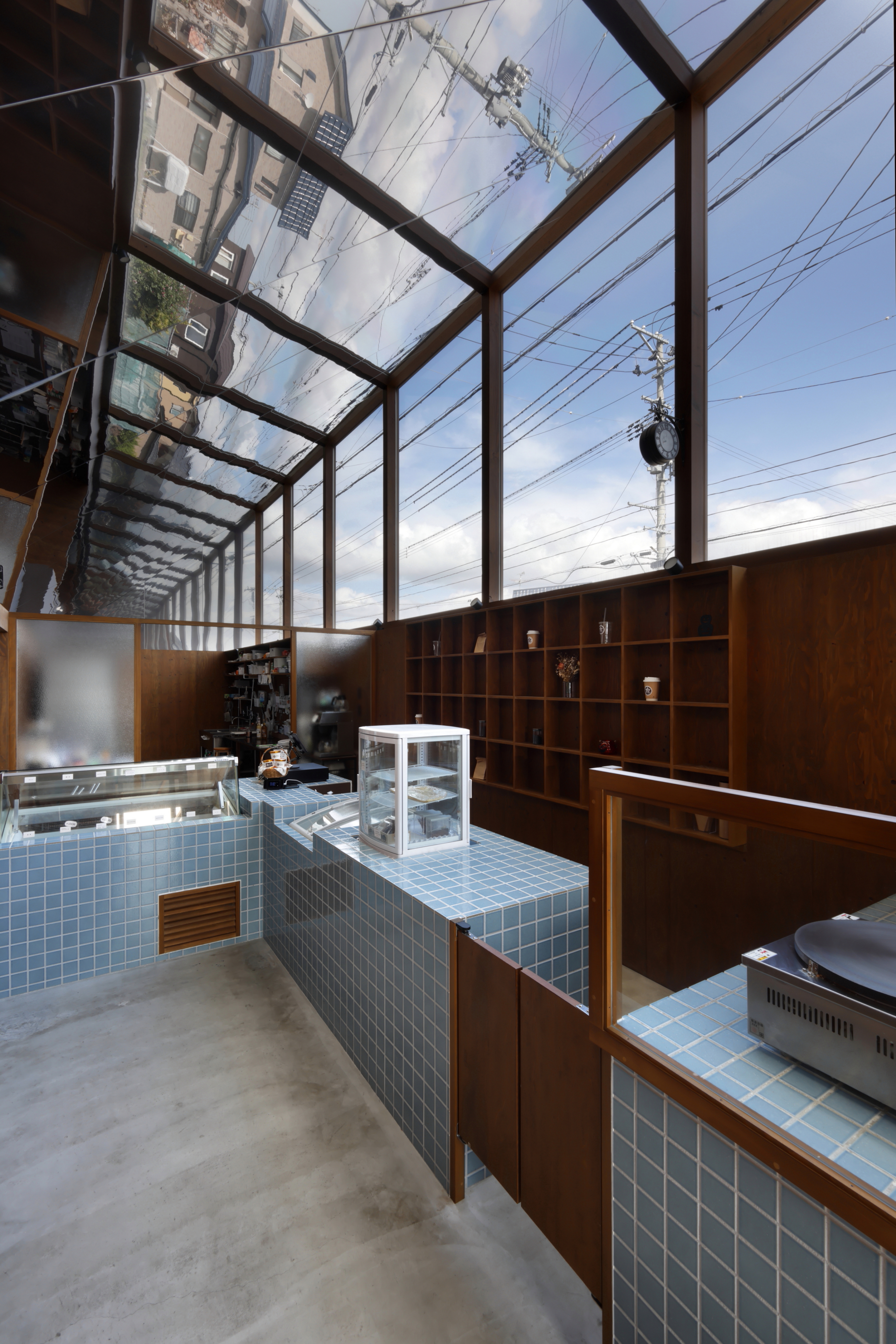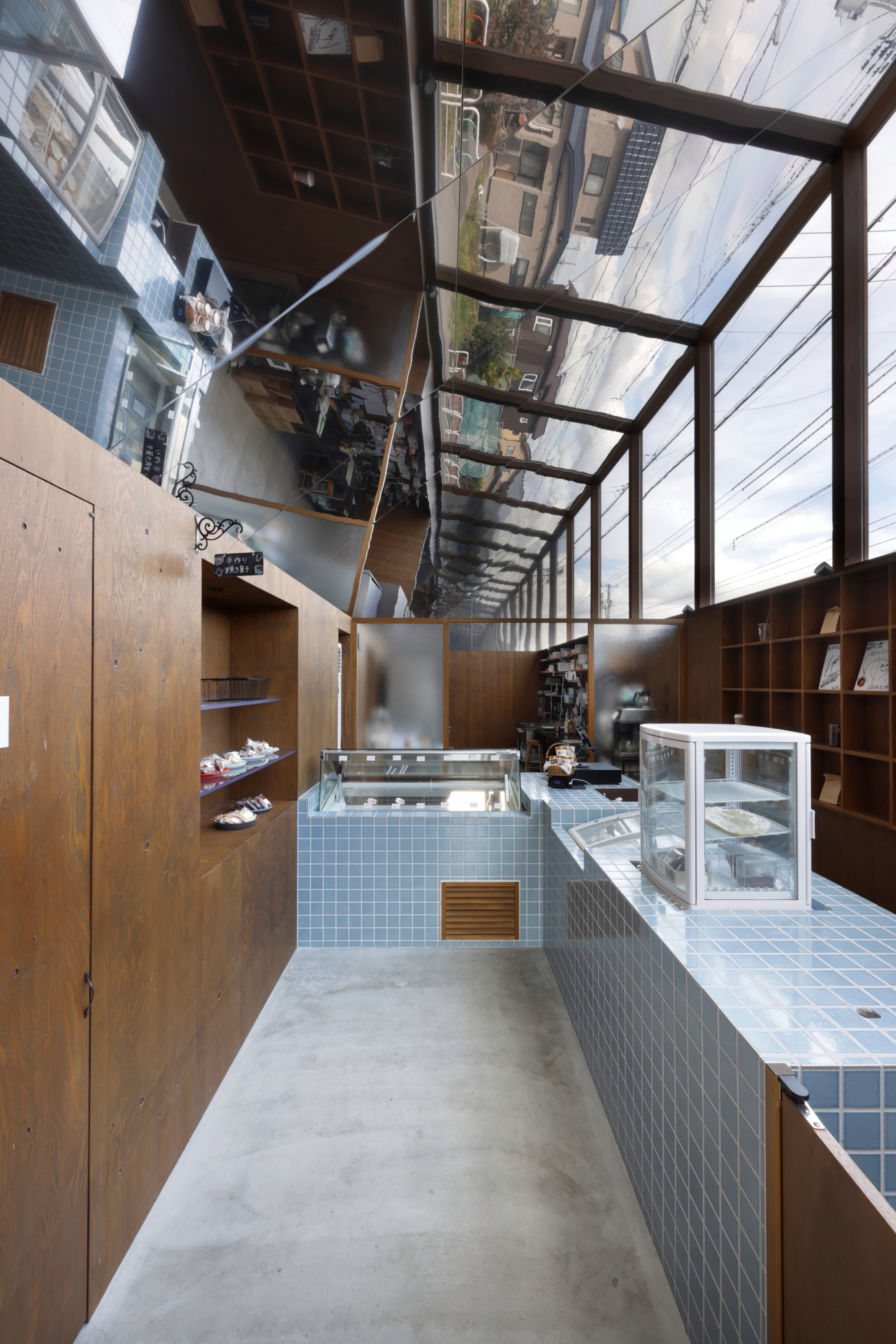 厨房まで含めたショップ全体を鏡面の勾配天井で覆い