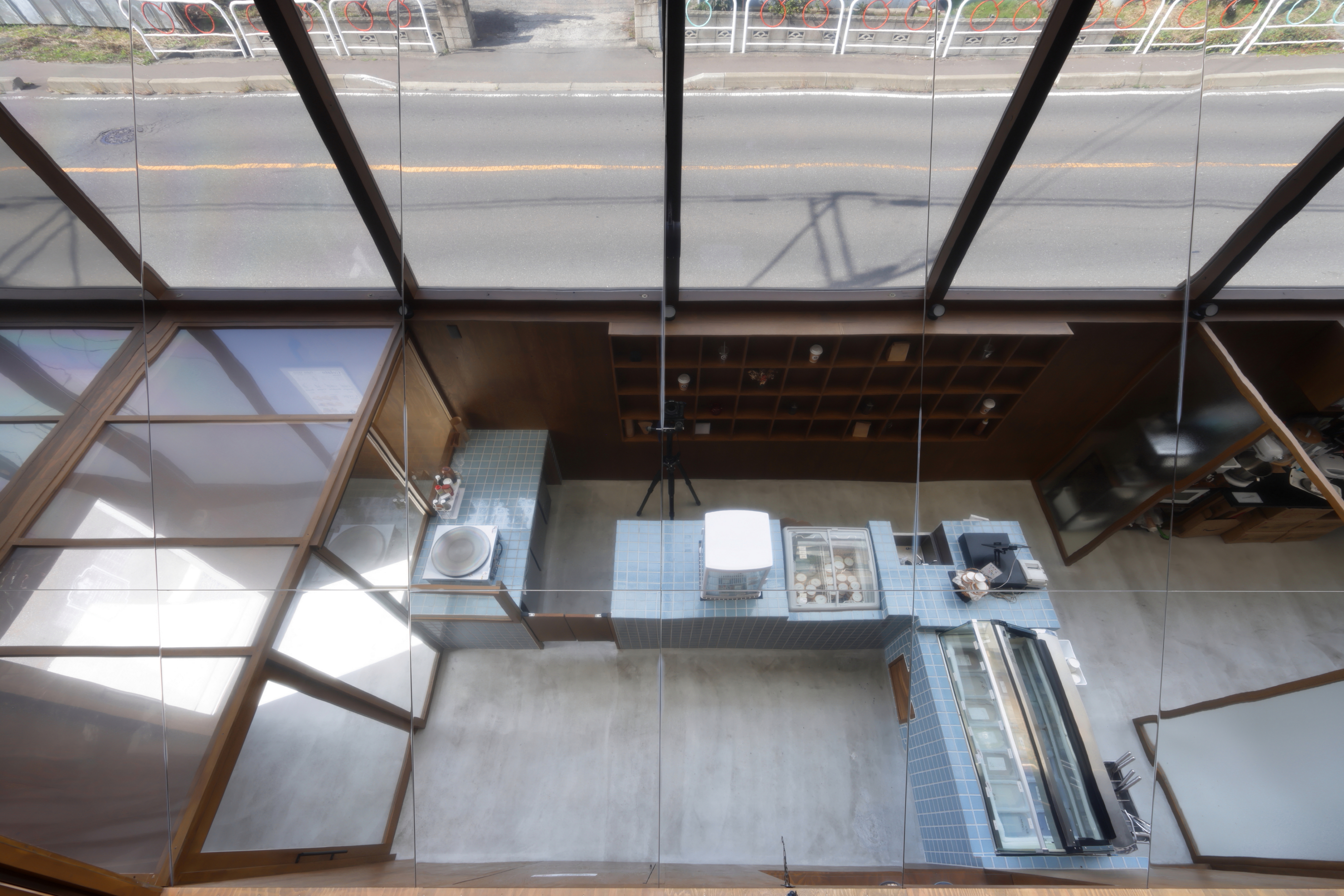外から建築を眺めると、ガラスの開口部を通して店内を見下ろす光景があります。
