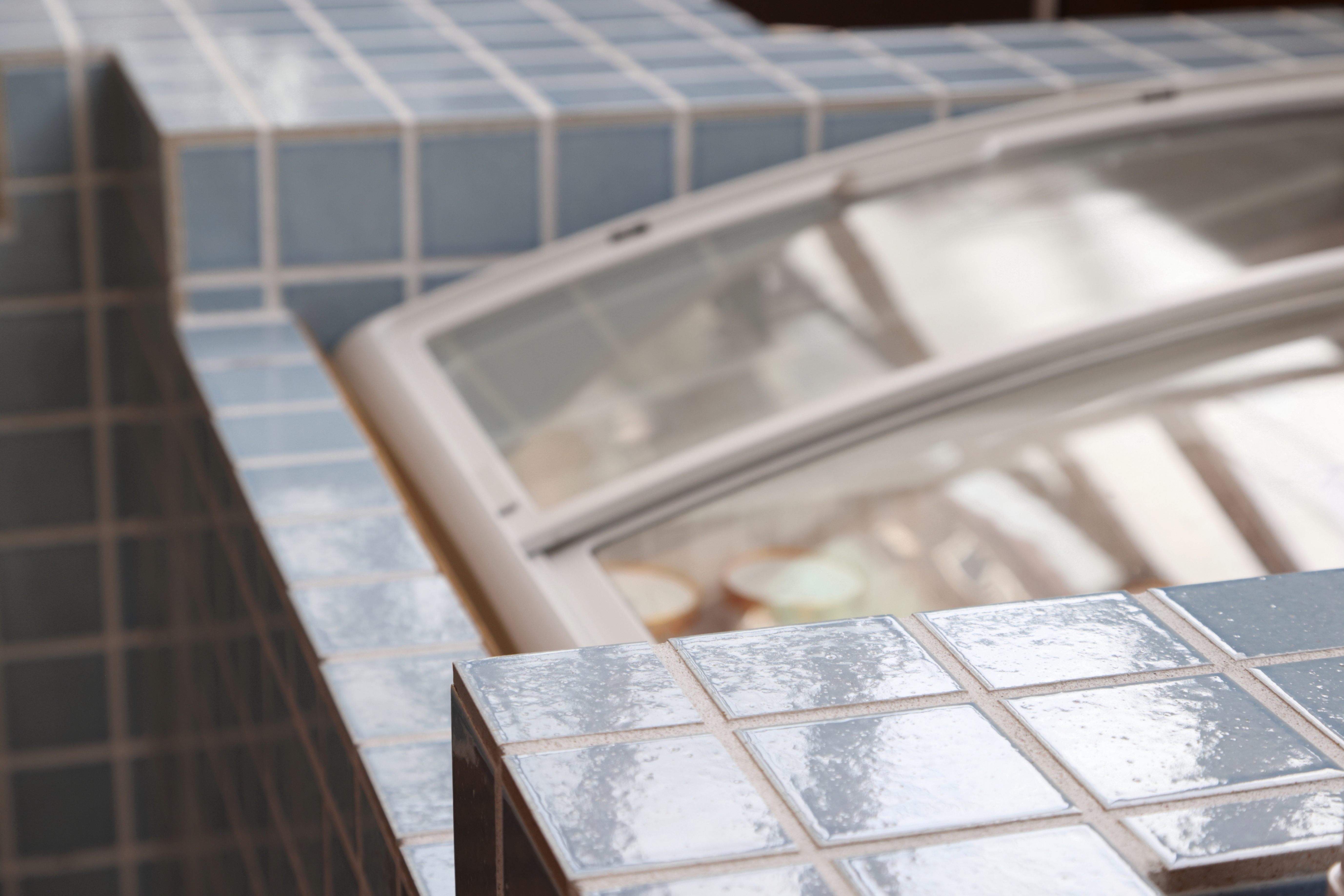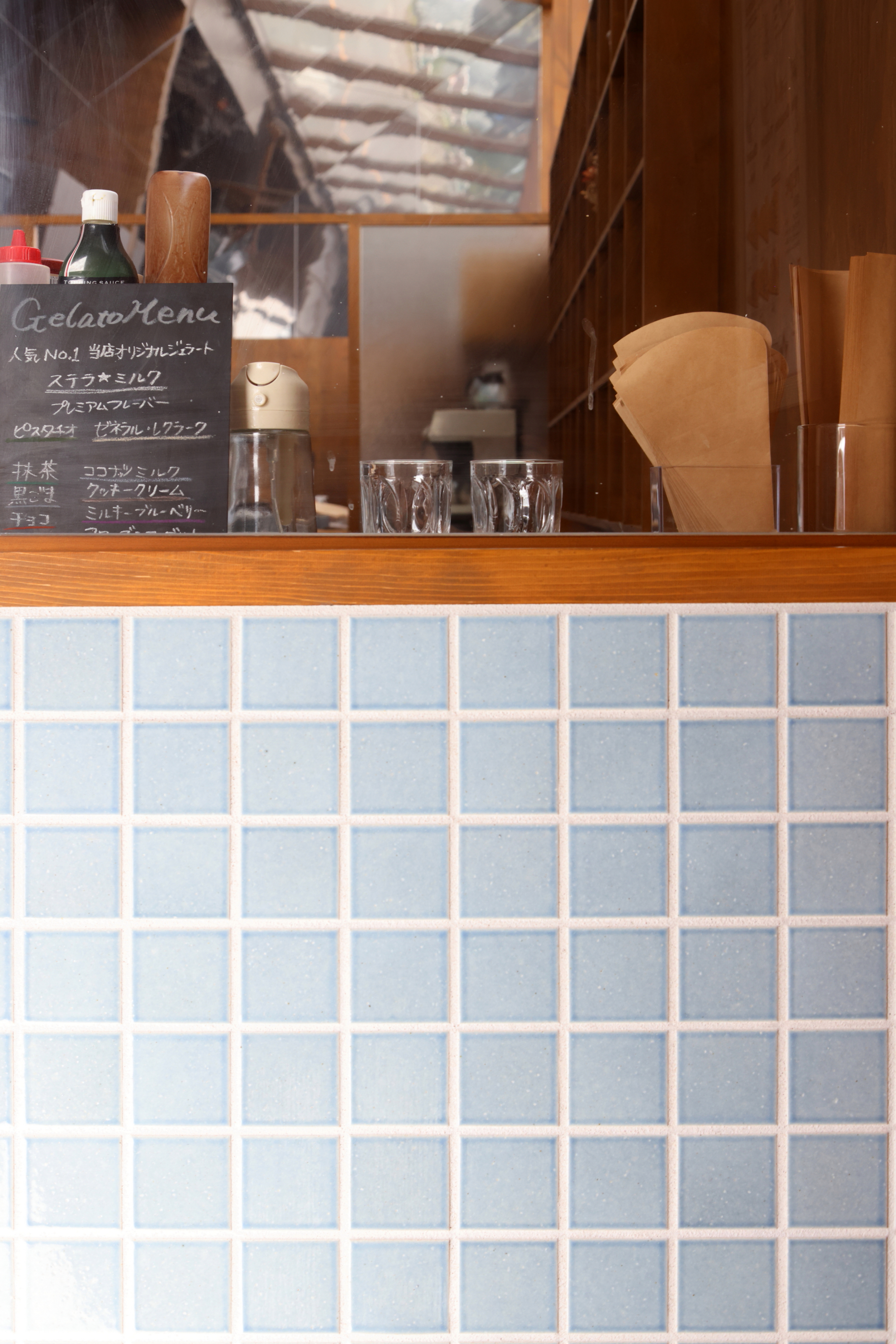 空間の雰囲気をつくっていて、お客はその風景の下でジェラートを選びます。