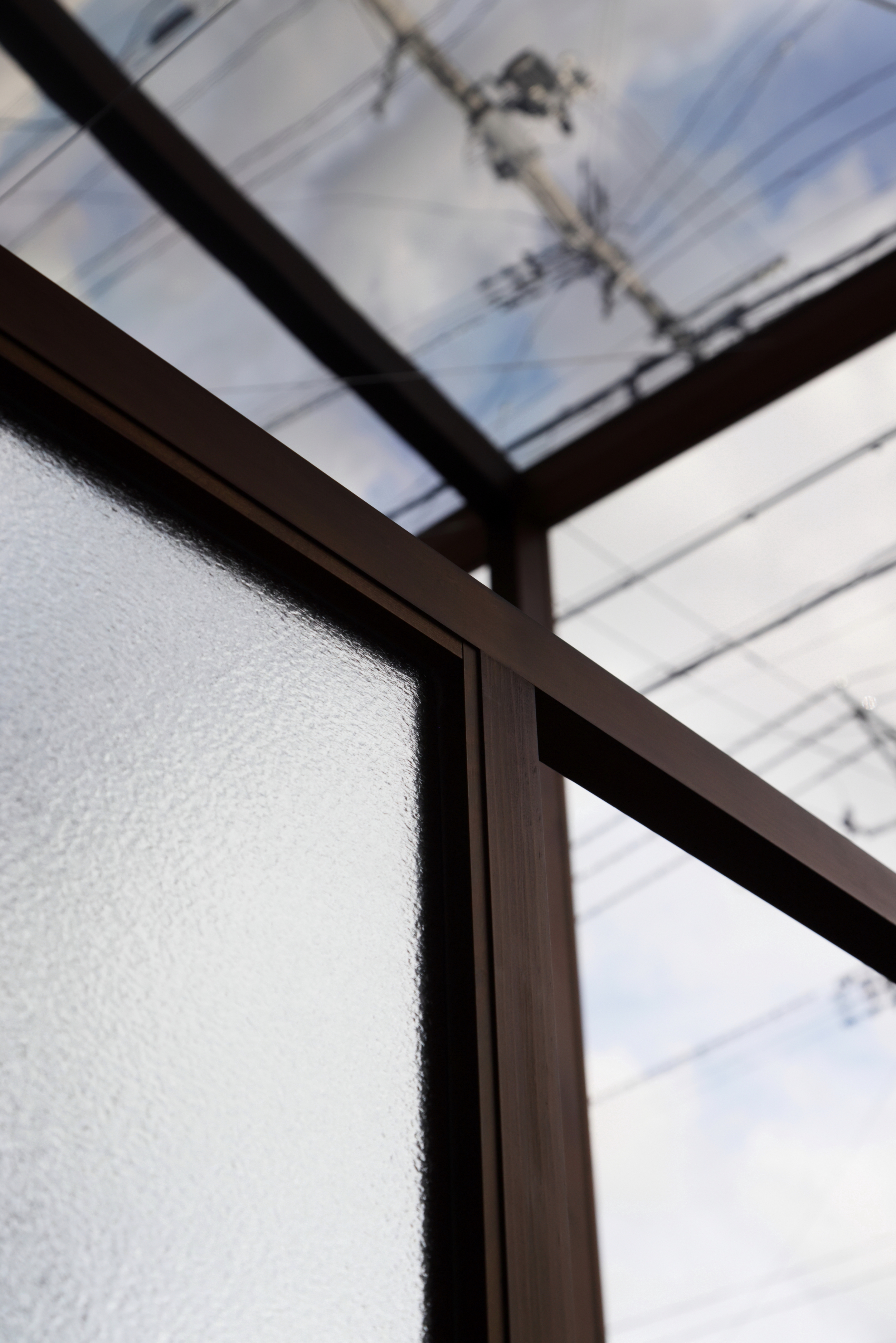 勾配天井と向き合う垂直面は、全面ガラスで内外をつないでいます。